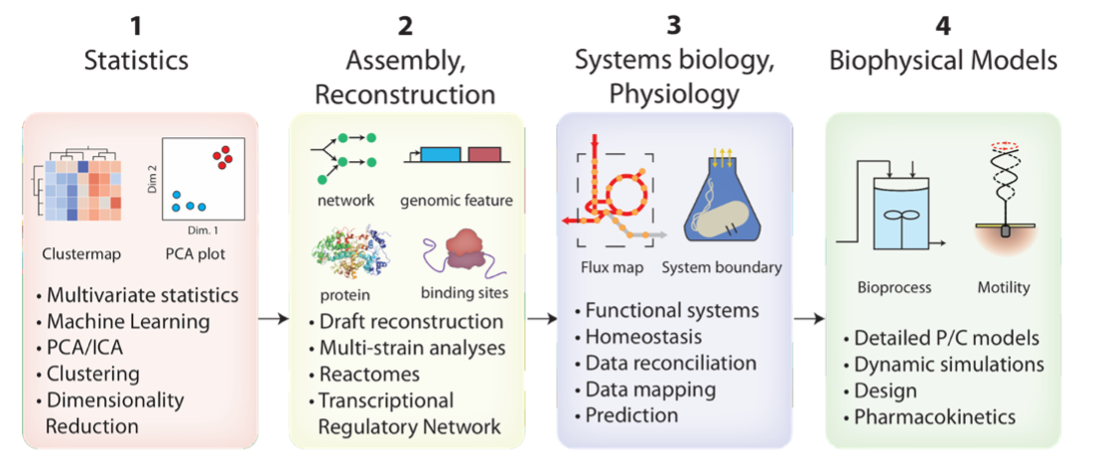 Analysis of large biological data sets can take place at four levels. At level 1 we perform multi-variate statistics, at level 2 knowledge-enrichment of large data sets, at level 3 systems biology and computational modeling, and at level 4 detailed biophysical modeling. Levels 1 and 4 are well developed in the literature. The history of genome-scale models, level 3, is about 20 years old with much progress made. Level 2 is the least developed and is focused on knowledge mapping and the use of machine learning and explanatory AI.