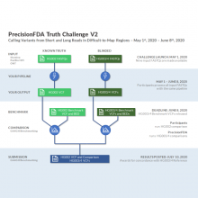 In the context of whole human genome sequencing, software pipelines typically rely on mapping sequencing reads or assemblies to a reference genome and the subsequent identification of variants. One way of assessing the performance of such pipelines is by using well-characterized reference datasets such as Genome in a Bottle’s 7 human genome benchmarks. Two of these benchmarks were used in the first precisionFDA Truth Challenge, which assessed variant calling accuracy in “easier-to-map” regions of the genome. The Genome in a Bottle Consortium led by the National Institute of Standards and Technology (NIST) has developed expanded benchmarks for HG003 and HG004, the parents of an Ashkenazi trio. Before their release, precisionFDA and NIST are running a new truth challenge focused on variant calling in more challenging genomic regions.