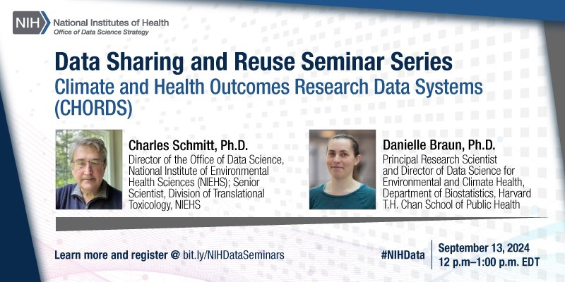 Charles Schmitt, Ph.D. and Danielle Braun, Ph.D. will present "Climate and Health Outcomes Research Data Systems (CHORDS)" on September 13, 2024, from 12:00 p.m.–1:00p.m. EDT.